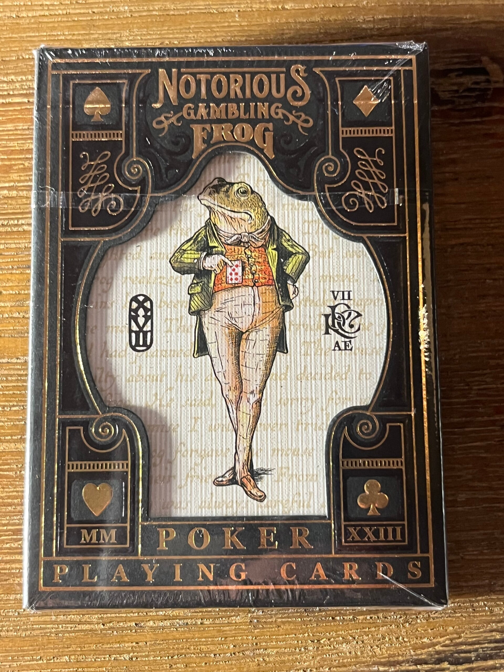 The Notorious gambling frog is a standard deck with redesigned standard court cards. It is designed to look classic with a touch of art nouveau style on the back design. The deck features high readability with its 4 corner index, which is great for playing card games and for card tricks.