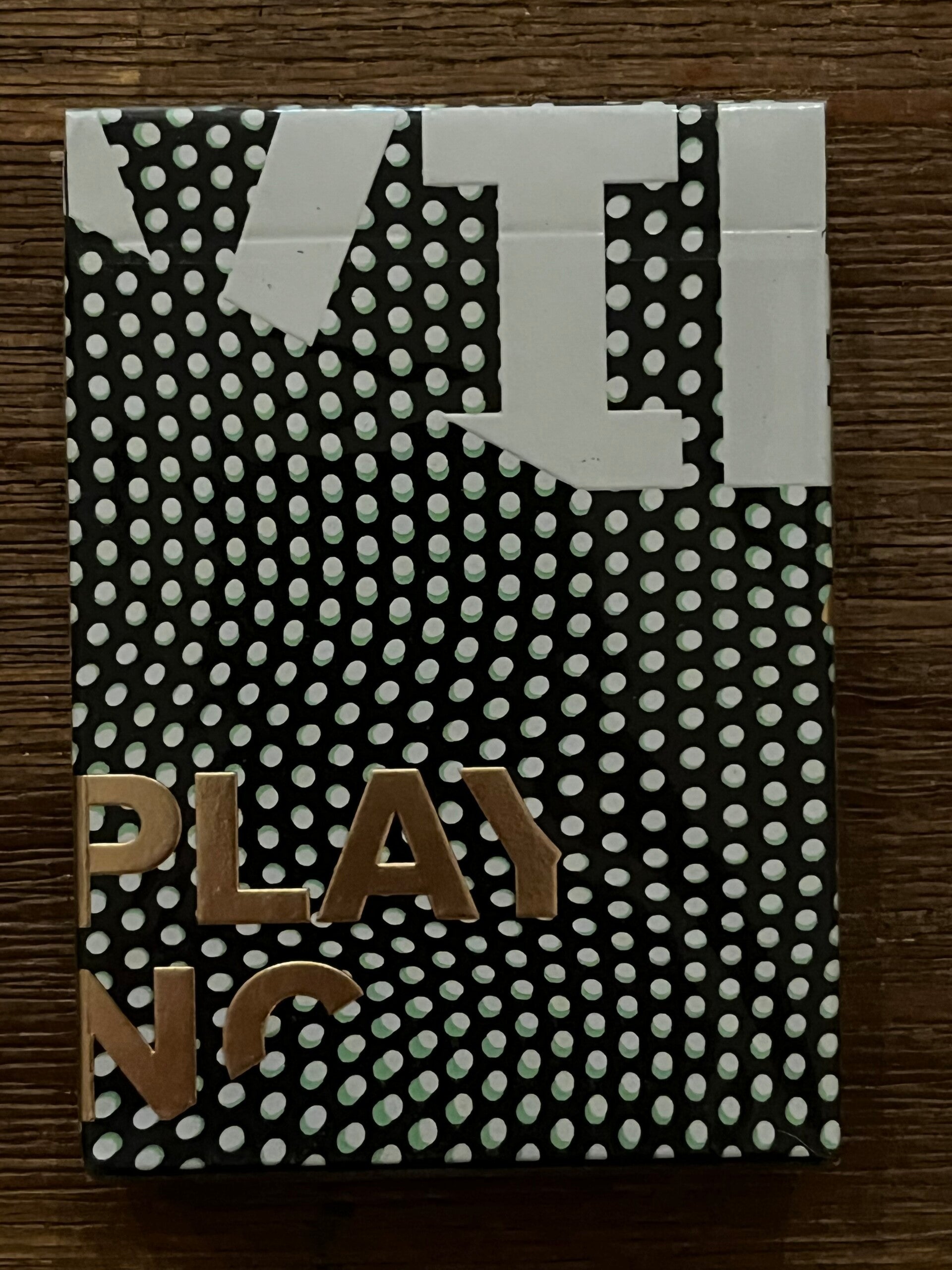 The cards are designed from scratch and 100% custom. The back design features the motion-like bending VIEWS dots with a mint undertone to create the illusion. The face cards have custom pips, and the courts have Pantone metallic inks.