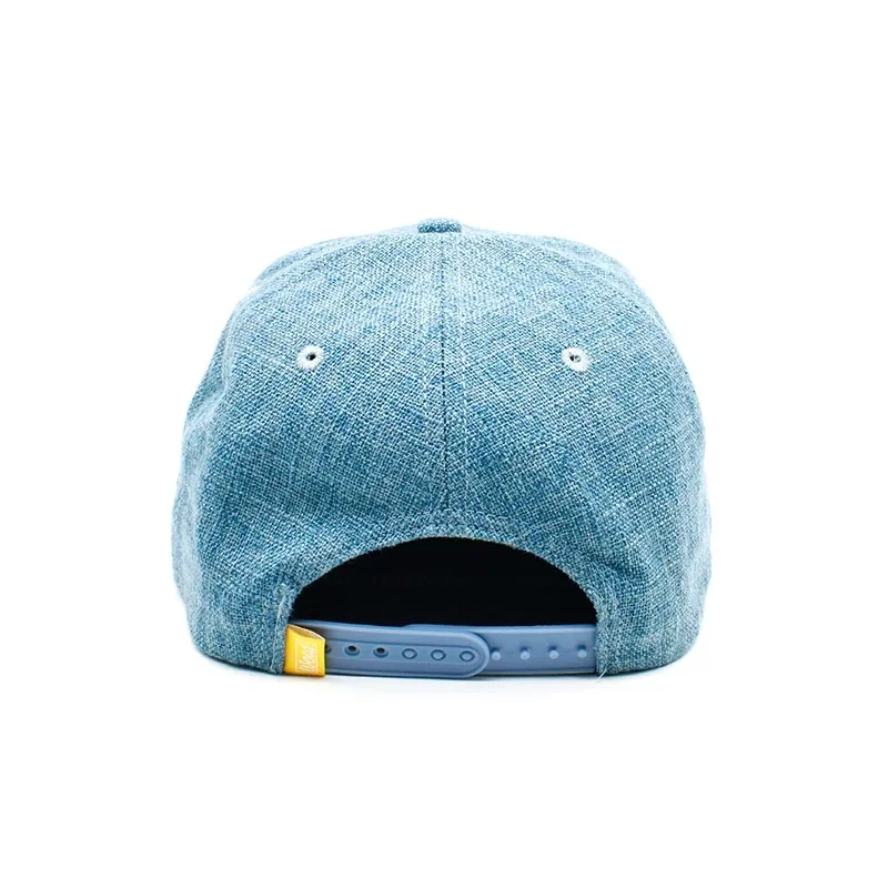 This light blue snapback is a unique accessory that is sure to attract attention. With a cork flap at the back, this cap exudes a natural and earthy charm. The front panel is enriched with white embroidered text, providing a sharp contrast to the soft blue color.